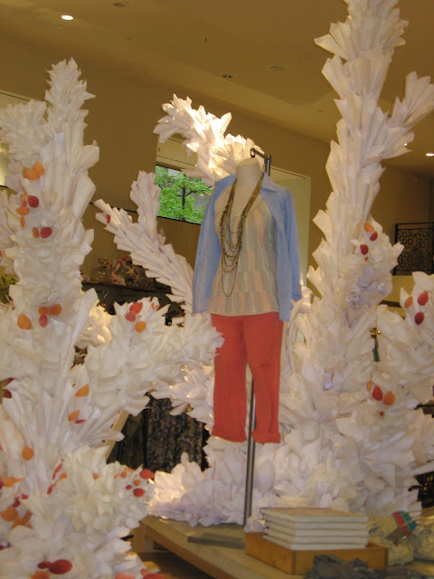 This display was by the other door. It's made of paper flowers shaped like a wild sort of coral reef with, of course, a pair of pedal pushers in the middle of it. Or is that petal pushers? Because, I mean, what's a coral reef without a mannequin and casual clothes popping right out of the middle of it?